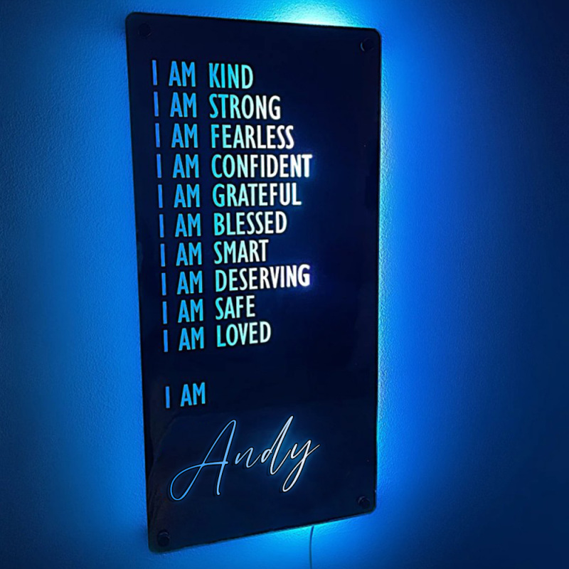 - This super stylish personalised name mirror with LED lighting is a perfect and unique edition to any youngsters bedroom, they will love lighting up the personalised mirror and seeing their own name in lights.This eye-catching personalised name mirror makes the perfect gift for 2023 and it will be cherished and loved for many years to come by the recipient.Includes remote control for LED lighting and chrome wall mounting stand offs.