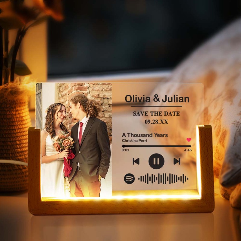 This unique anniversary gift will add a special touch to your loved one's home. Our personalized night lights come with a photo plaque, a song plaque, and a Spotify code for the perfect musical memory. Celebrate your love with a functional and meaningful gift. Make it extra special with our Anniversary Gifts Save the Date personalized photo acrylic song plaque custom night light lamp.