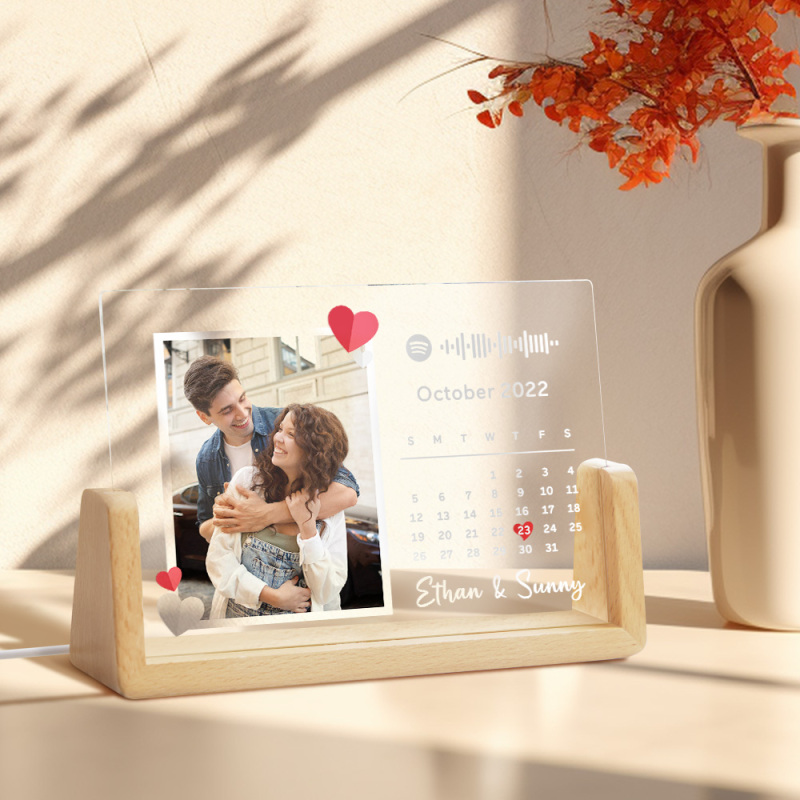 Celebrate your love with our custom calendar acrylic night light, a perfect blend of memories and music designed especially for couples. This elegant and modern plaque combines your favorite photo, a personalized calendar, and a Spotify code to create a unique and meaningful anniversary gift.