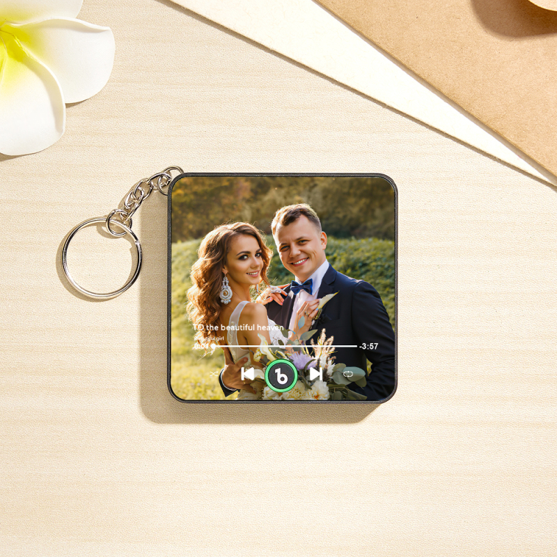 Celebrate memories with this Personalized Photo Mini Music Fridge Magnet Keychain - a mini music box you can carry anywhere. Made of premium-quality acrylic, this durable and stylish accessory features crystal-clear sound and a push-button playback function, letting you enjoy music instantly without using a cell phone.