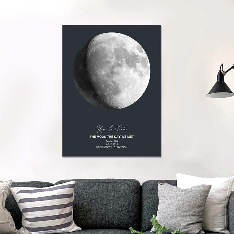 Every day and night as the moon continues its steady orbit around planet earth, and a small section of the moon which faces toward the sun will be lit up for us to see. These different shapes that show the bright section of the moon can be seen from our planet earth, and they are referred to by many as moon phases. The moon will have been in a completely unique phase when your magical moment took place, and this is what will be shown in your personalized moon phase poster.