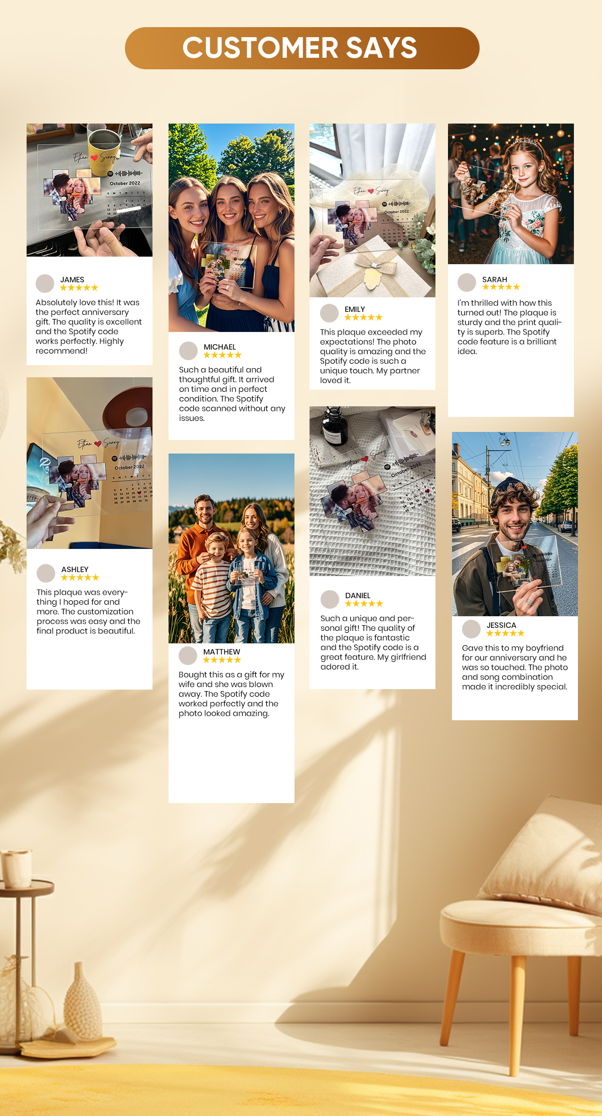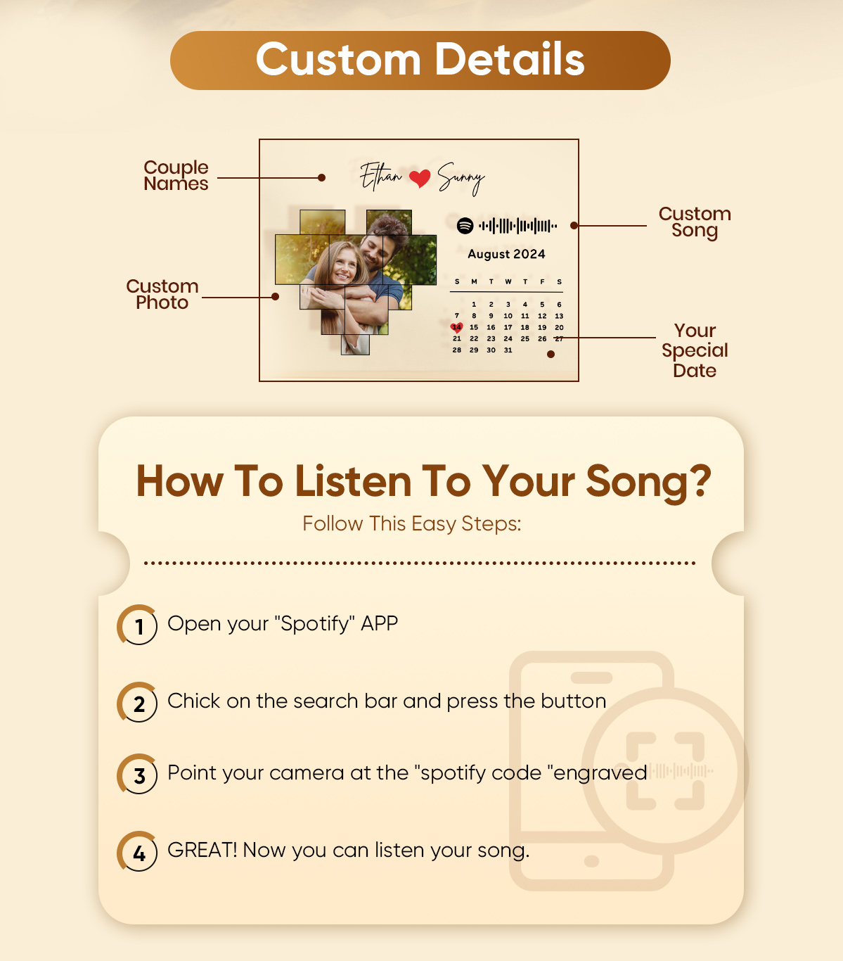 This unique acrylic plaque is a perfect gift for him/her on the anniversary. Customize the Spotify plaques. We offer three types of options: keychain, plaque, or night light. You can choose any song title, artist name, and favorite photos you want, all can be imprinted on the plaque, and then you can generate a unique Spotify code. Please note that the acrylic plaque itself does not emit music. You have to scan the code on the Spotify app, after scanning the code on Spotify, your song will start playing immediately. On any memorable day, this is the most romantic gift, play the most beautiful music for your love.