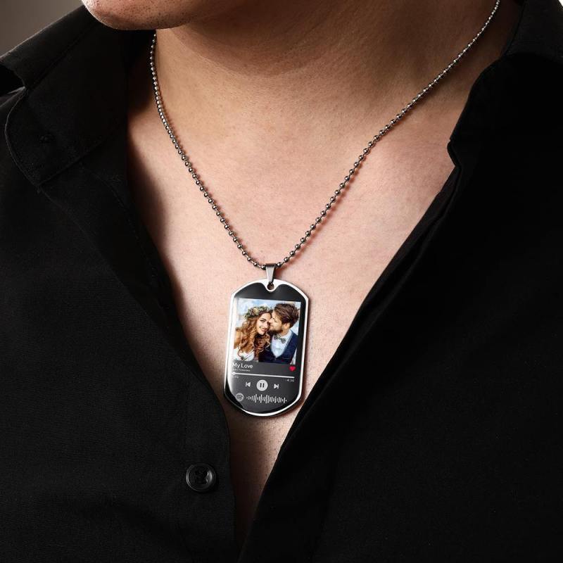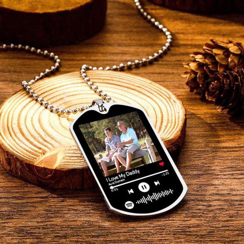 Make a unique and memorable gift for her/him, any Holiday or special occasion with this customizable ID Tag. Just add your favorite picture at the front and a Spotify code with your selected song or a playlist on the back.