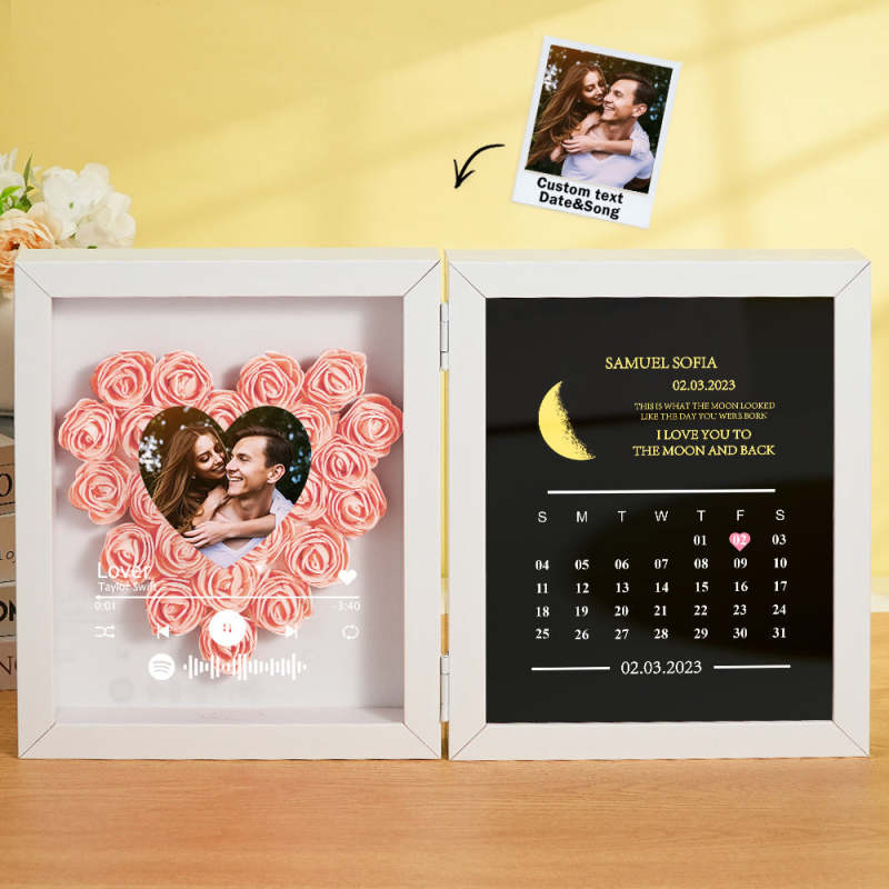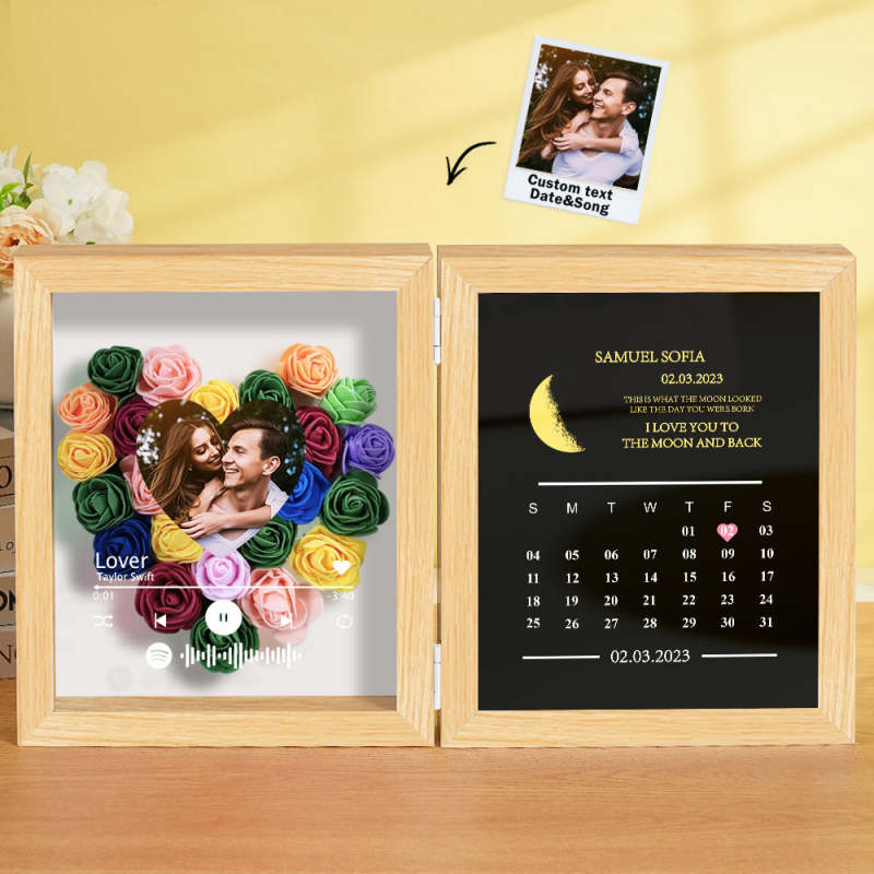 This personalized flower box frame is a memorable gift for her, featuring a custom Spotify code and photo. Choose the date for a printed moon phase and calendar, adorned with your own words and name. Select from a variety of rose colors for a truly unique and special present.