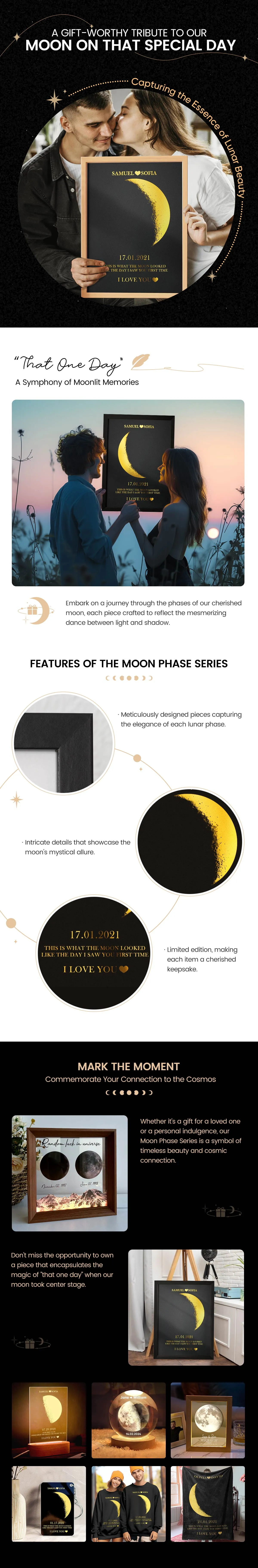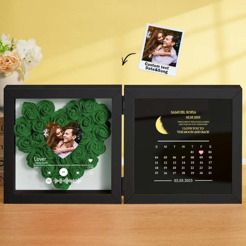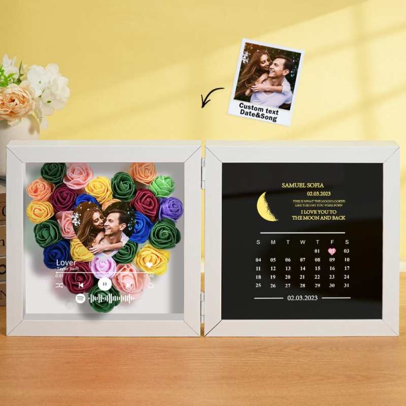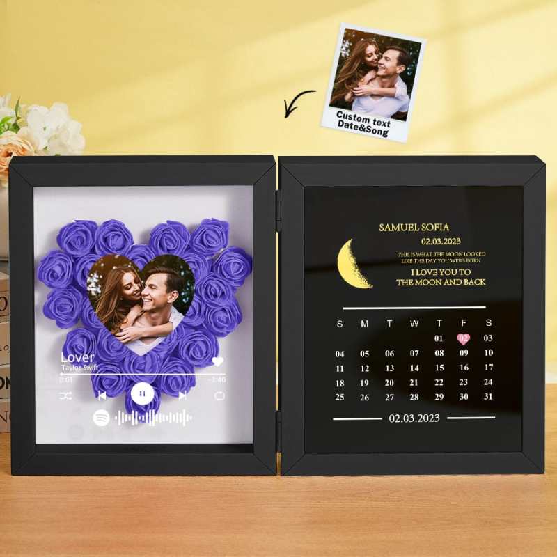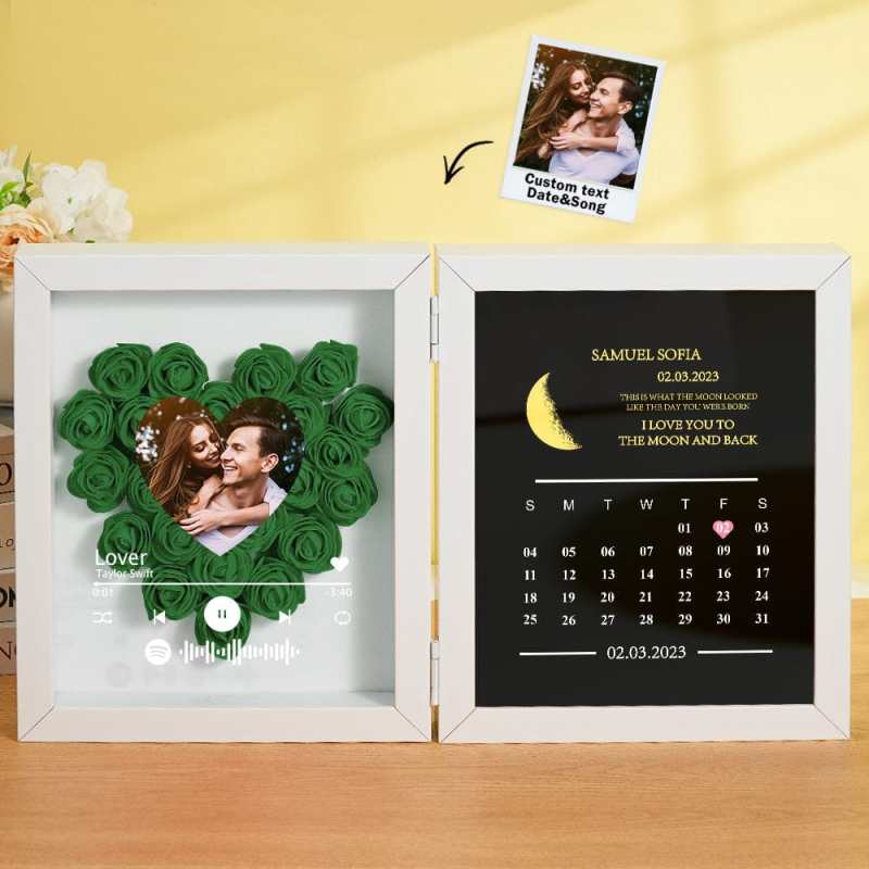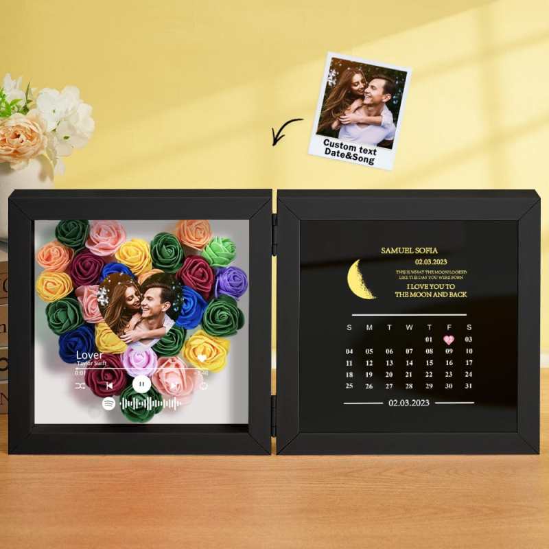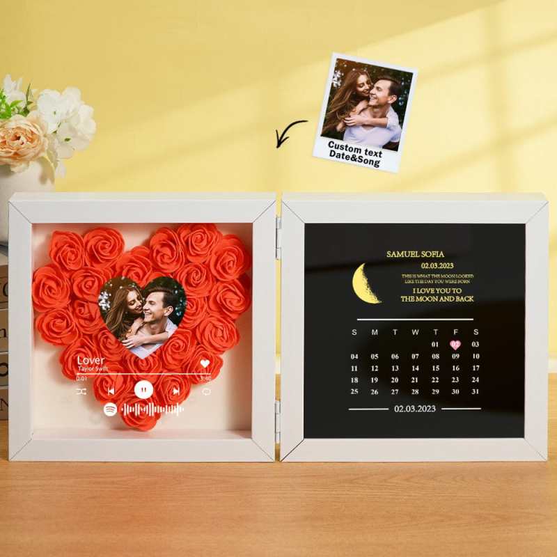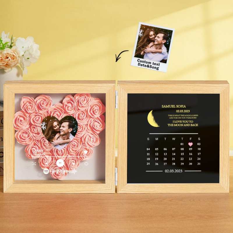 This personalized flower box frame is a memorable gift for her, featuring a custom Spotify code and photo. Choose the date for a printed moon phase and calendar, adorned with your own words and name. Select from a variety of rose colors for a truly unique and special present.
