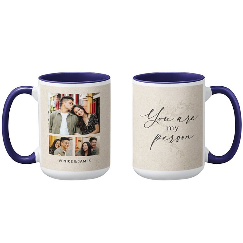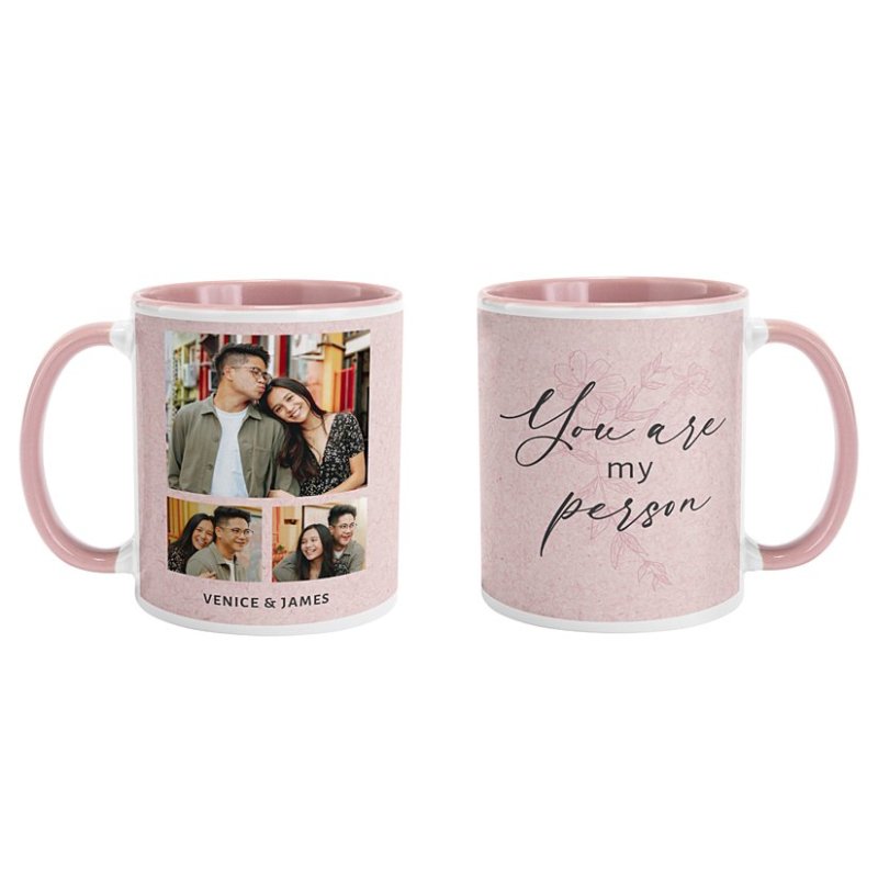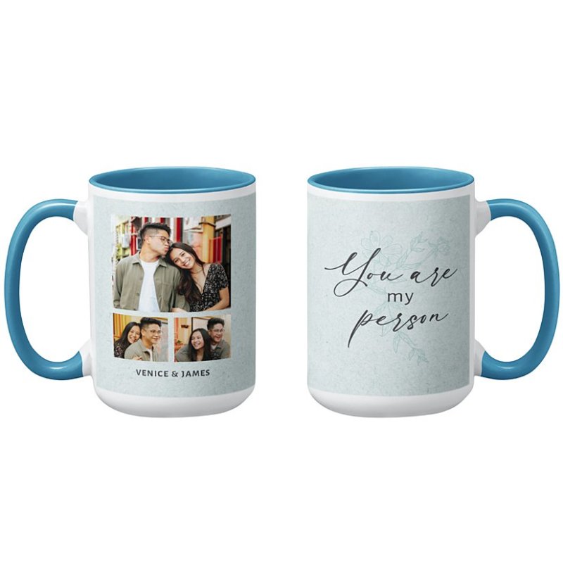 The mug is available in a range of soft, stylish background colors, including pink, blue, gray, and cream, so you can pick the perfect shade to match your style. One side features your custom photo collage, while the other displays the heartfelt phrase "You Are My Person" in elegant script. You can also add your names for an extra personal touch.