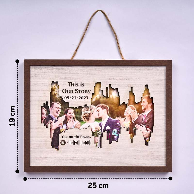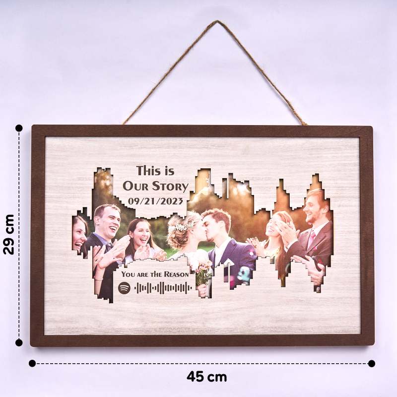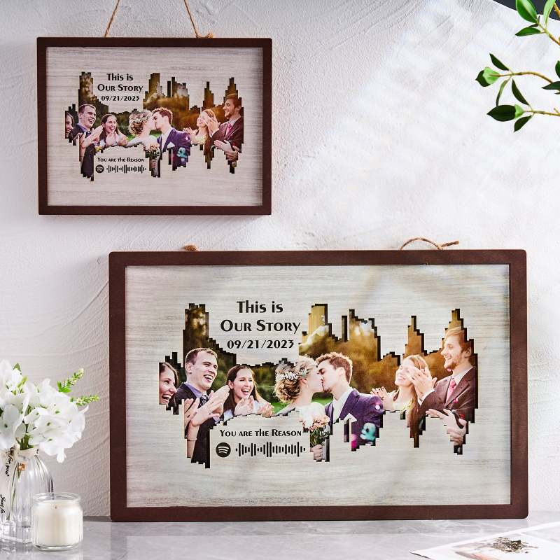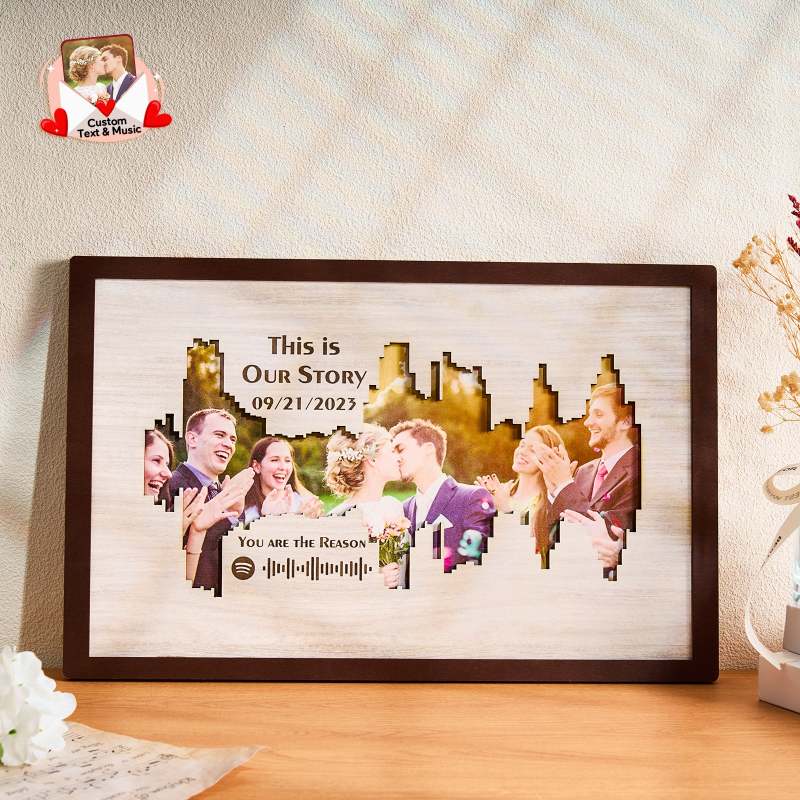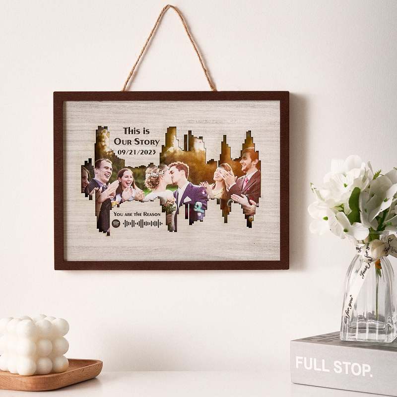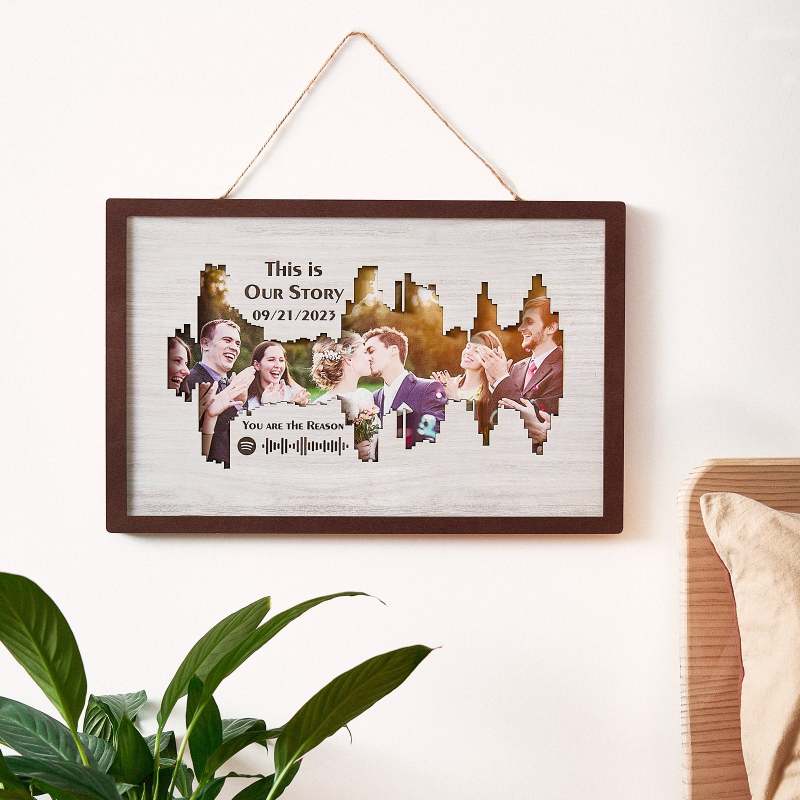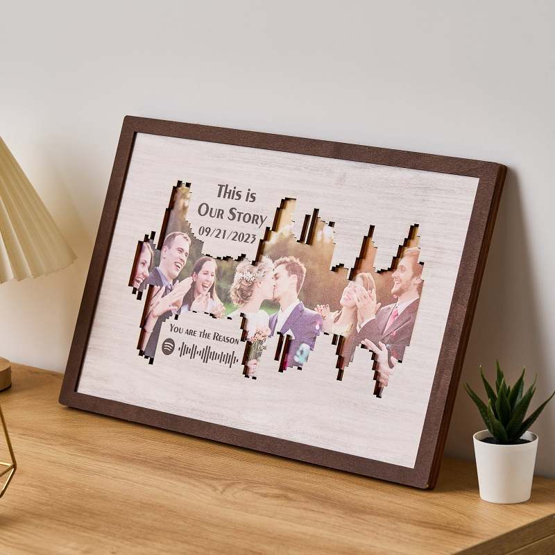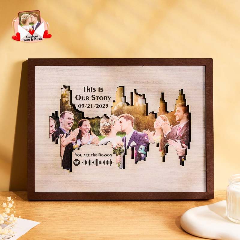Enhance your home decor with our Personalized Photo Spotify Code Music Sound Wave Shaped Photo Frame. Immortalize your special memory with a unique sound wave shaped custom photo, accompanied by a custom Spotify code, date, and message. The perfect meaningful gift for music lovers.