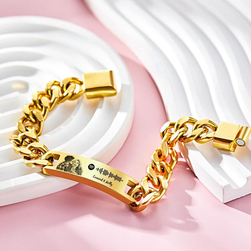 This unique bracelet is the best perfect gift for him.Made from stainless steel,like your love for him could last forever.Custom the Spotify code bracelet,with engraved photo and words,choose your favorite song,photo and words, all can be imprinted on the bracelet, and you can generate a unique Spotify code. You can scan the code on the Spotify app, after scanning the code on Spotify, your song will start playing immediately. It's a perfect gift for couple's anniversary,for valentine's day,wedding day gift,and various occasions.
