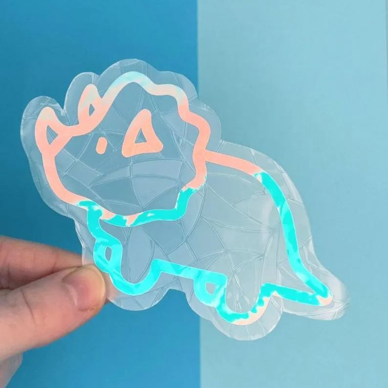 Each suncatcher is 12cm x 8.3cm and each one has a holographic dino over the top of the background shape.