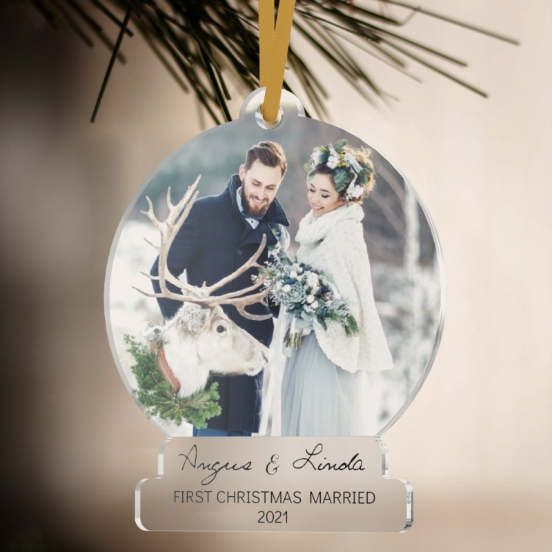 This beautiful personalised snow globe Christmas decoration is a perfect way to celebrate your first Christmas as a married couple or is a lovely unique gift idea for your family members, friends or indeed anyone you love. Professionally UV printed with a photo of your choice makes for an extra sentimental Gift or Decor item for the home.