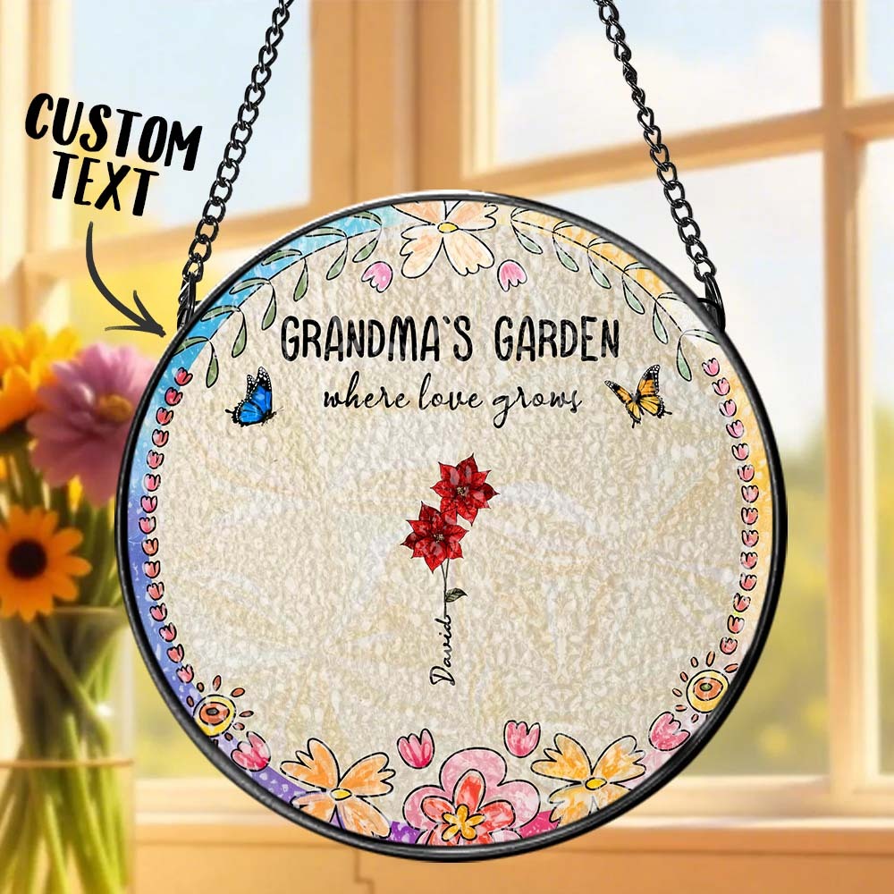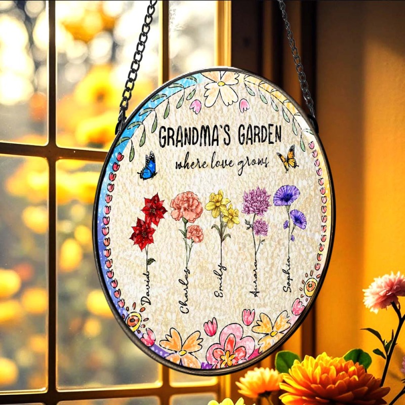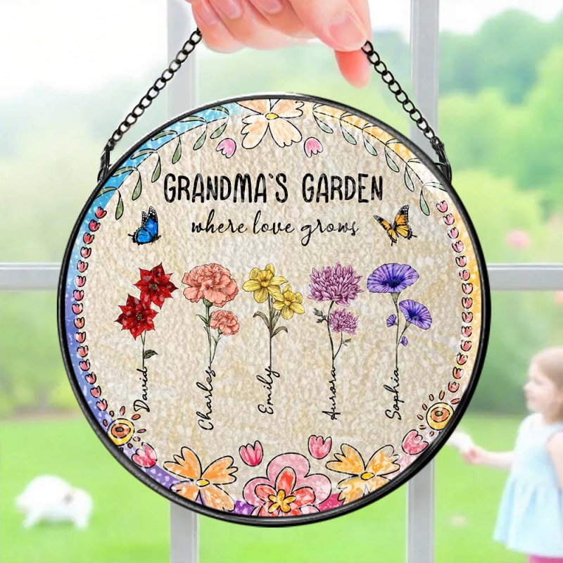 Personalized Birth Flower Suncatcher: This beautiful glass suncatcher features custom-arranged birth flowers, creating a unique and personalized gift for grandmothers and mothers.